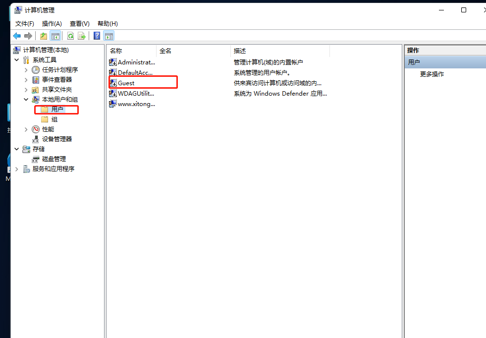 3、在计算机管理窗口中,点击左侧展开本地用户和组,然后选择Users,找到并双击右侧打开Guest;