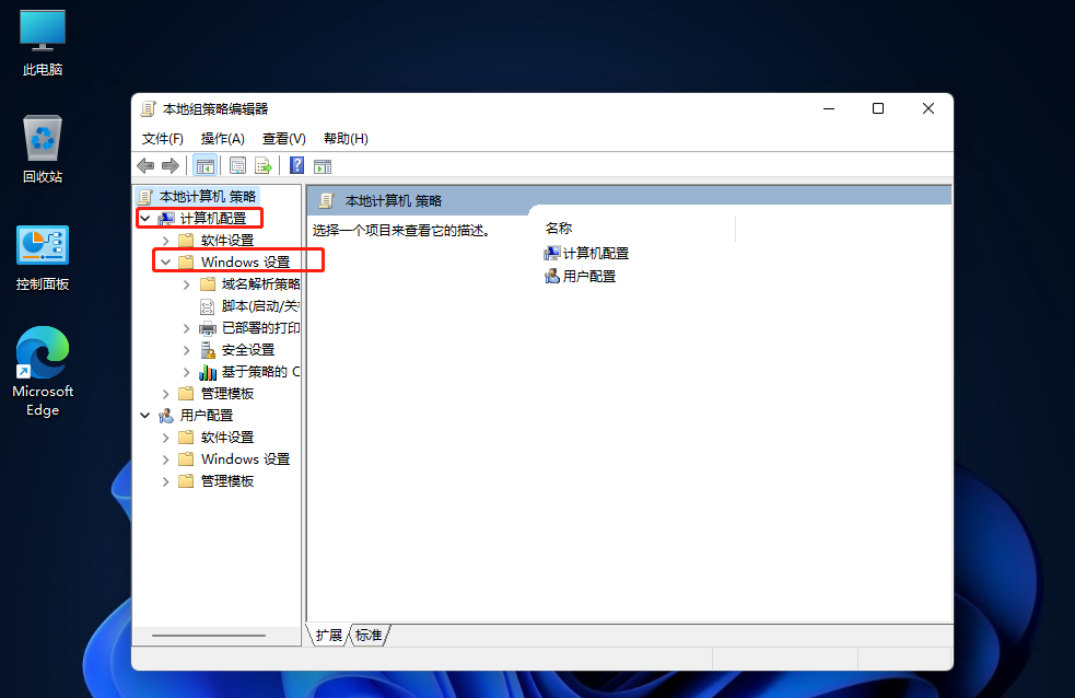 3. 在“本地组策略编辑器”窗口中,单击展开“计算机配置”,然后单击下面的“Windows 设置”;