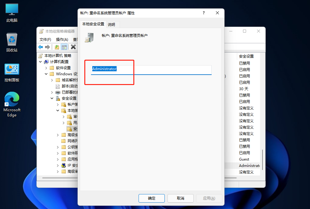 6.帐户:重命名系统管理员帐户属性窗口,修改Win11用户名。