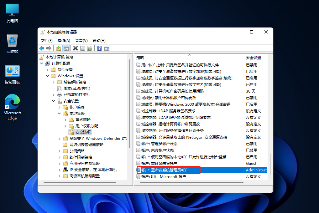 5、右侧找到并双击打开账户:重命名系统管理员账户;