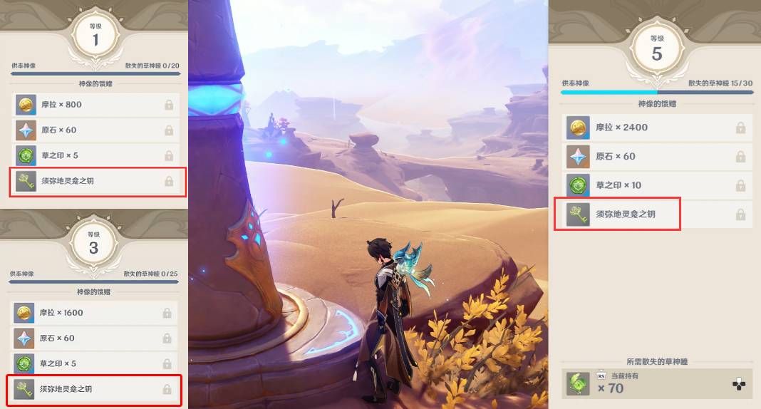2、收集散落的草神瞳,供奉须弥像至2、4、6、8、9、10,获得6把钥匙。