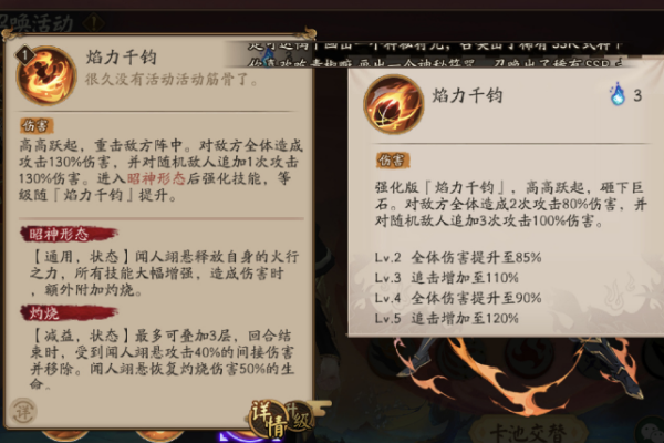 焰力千钧:角色释放技能跳跃至敌方阵营,对敌方全体人员造成130%的伤害。
