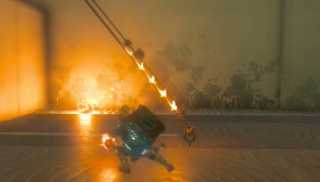6、绳子烧完后,图中的木板就会放下来。让我们用终极之手起身吧。