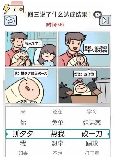 在“表情包大师里宝宝说了什么”关卡中,玩家需要思考宝宝说了什么才能达到最终的结果。在三栏文字中,找到“品兮兮”、“帮我”、“砍刀”。选择后,点击提交按钮。当图4爸爸出现并说拿走你的时,你就可以顺利过关了。