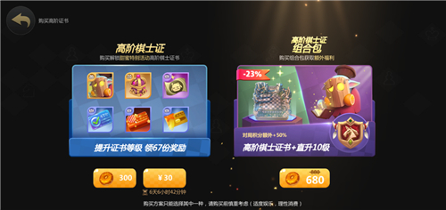 在主界面点击商店即可购买高级证书。有两种类型:300 颗糖果和680 颗糖果。高级棋手包除了可以直接升级到10级外,还拥有额外积分,可以快速认证棋手的水平。