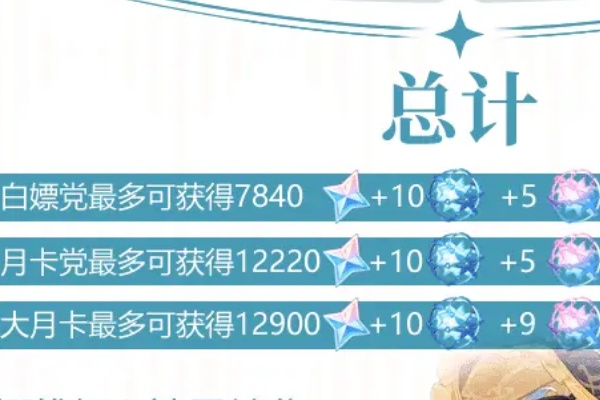 答案白嫖党最多可获得7840原石,月卡党最多可获得12220原石,大月卡最多可获得12900原石。