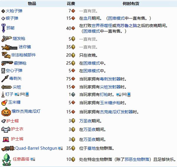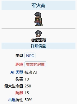 在游戏泰拉瑞亚中,军火商可以为玩家提供枪支和子弹的早期购买。办理入住手续时需要有一个空房间,并且手中或背包中有可发射的武器或弹药。早期神器迷你鲨鱼可以35金币购买。他在这儿买的。