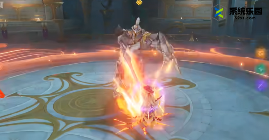 2.然后等待boss放大招式,先将剑插入地面并设置火圈进行大招,然后举剑放大招式。