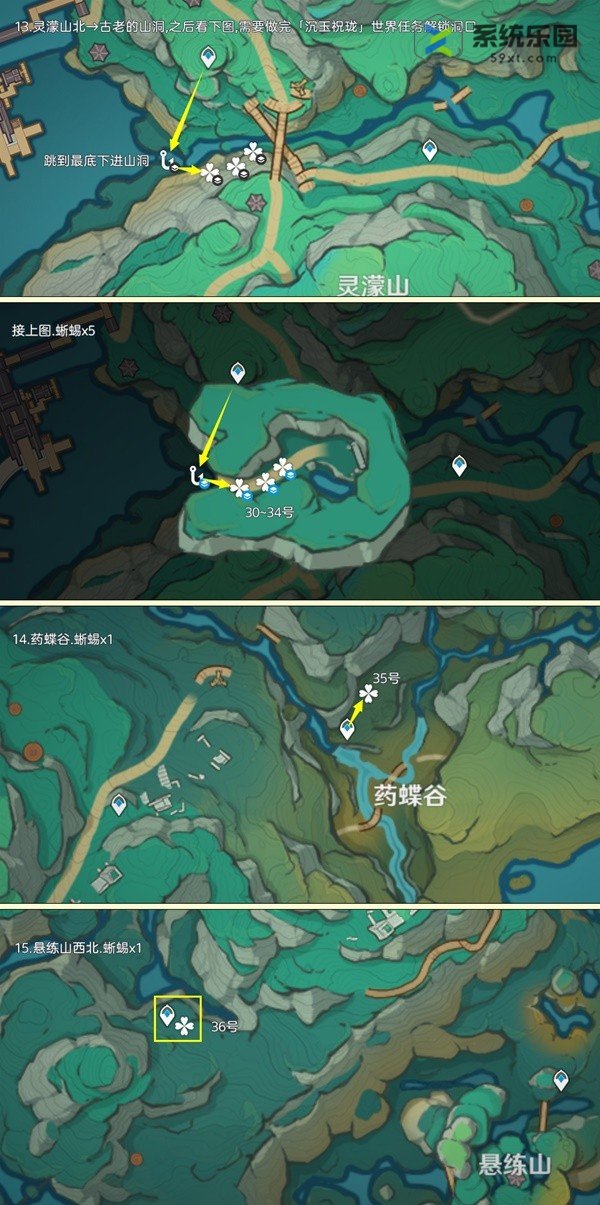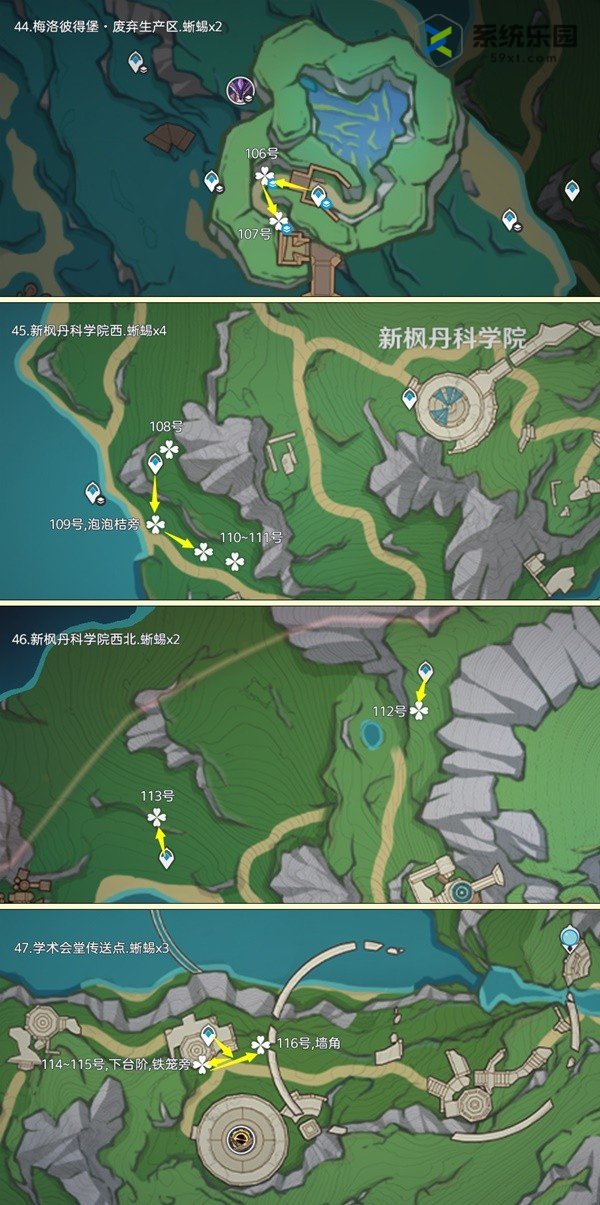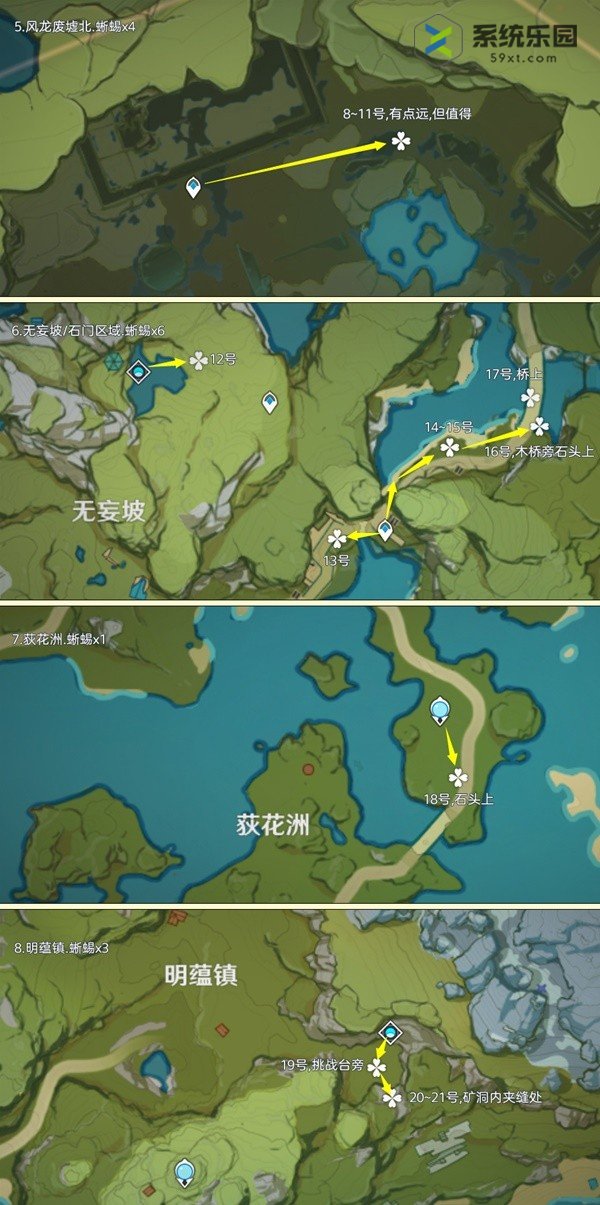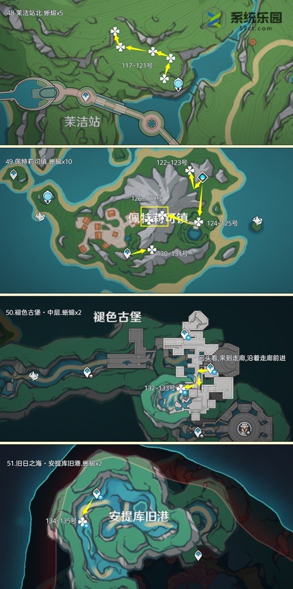 蜥蜴点在提瓦特地区分布很广,在地下矿区、深渊宫殿和远古之海也有几个。其中,每天可重复采集的数量为135个,佩特里奇镇地区有10个。