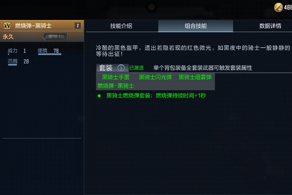 黑骑士手榴弹、黑骑士烟雾弹、黑骑士闪光弹三投形成一套后,即可激活套装属性:燃烧弹持续时间+1秒。