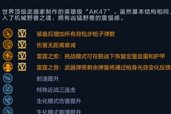 AK47-雷霆还拥有与M4A1相同的技能-雷霆:雷霆之息:武器弹匣中剩余弹药会通过枪身光效的变化反馈,雷霆治愈:挑战模式可以恢复一定量脱离战斗时的血液和盔甲。第一的。
