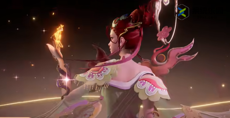 3.在发型设计上,采用中式盘发,饰有一些花卉、山脉、云纹图案。头后有一云纹光环,环内的火烛象征着照亮皮影戏的光源;