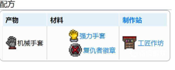 在游戏中,玩家需要准备一个工匠研讨会以获得机械手套,然后消耗爪手套和泰坦手套来形成强大的手套,然后消耗灵魂和普通徽章以形成复仇者奖章,最后结合了复仇者奖章和奖章。电源手套形成机械手套。