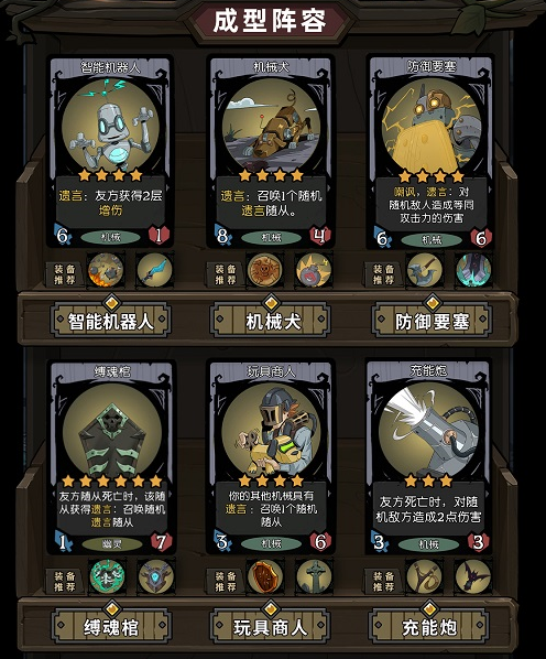 满月之夜的机械充电炮流的阵容可以选择智能机器人,机械狗,防御堡垒,围绕灵魂的棺材,玩具商人和收费大炮。形成速度非常快,在早期和中期可能会对其他对手造成相当大的损害。您还可以在后期的6本书中找到阵容的上限。