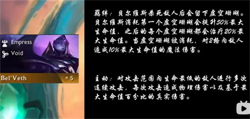 特性:贝尔维斯杀死敌人后留下虚空珊瑚。贝尔维斯消耗的第一个下界珊瑚将使最大生命值增加50%,随后的每个下界珊瑚将恢复最大生命值的20%。消耗虚空珊瑚时,对2格内的敌人造成最大生命值10%的魔法伤害。