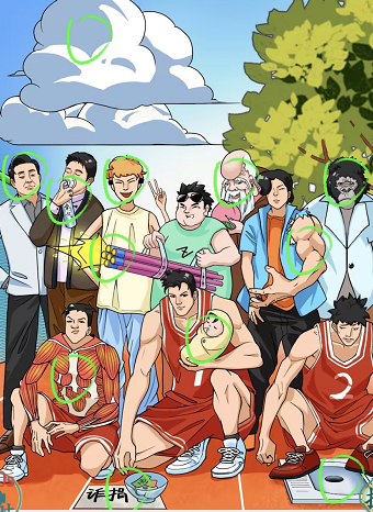3.中间站着一个寿星,蓝色衣服的人是独角兽手臂,左下角的人戴着装饰肌肉