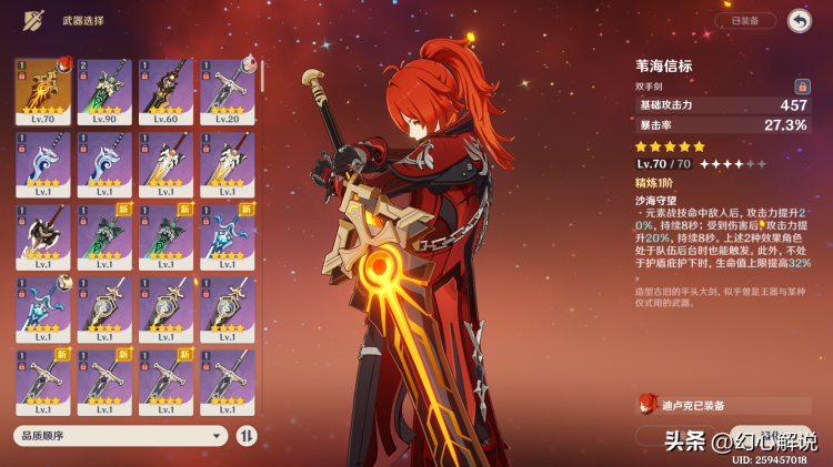 四星武器首选:【赤谷剑】被誉为四星巨剑的天花板,甚至有人认为迪卢克对【赤谷剑】的使用比【狼之末路】还要好。个人认为【赤谷剑】不如狼魔,而且【赤谷剑】还需要搭配屏蔽符:搭配使用,或者使用硬技。