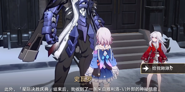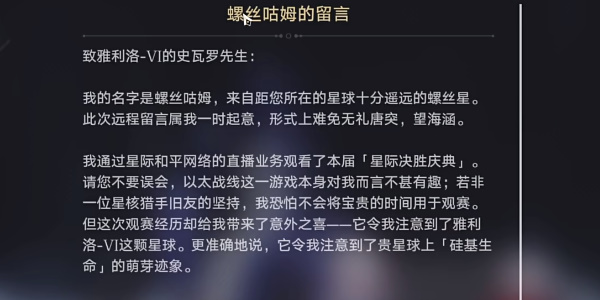 4.选择聊天后,Swaro会告诉玩家,他收到了外界的神秘消息,玩家可以查看更多。