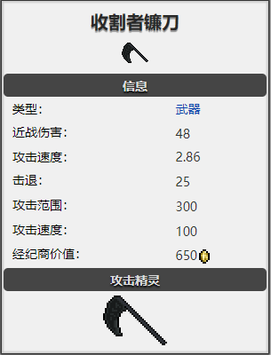 死亡镰刀是Boss“死亡”掉落的近战武器。挥动时,它会释放出具有巨大冲击击退能力的导弹,可以穿越地形并穿透最多3 个目标。