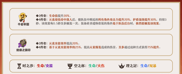 .辅助圣物套装,主要选择4件千岩,增加场上攻击模块角色的攻击力,主要叠加生命值(这个玩法是叠加生命值.jpg)