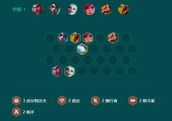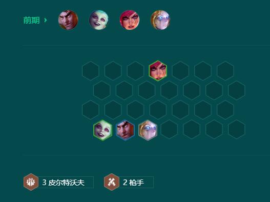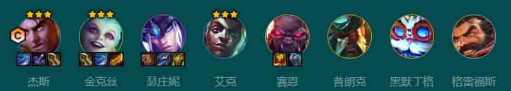 阵容羁绊3 皮尔特沃夫, 1 大发明家, 1 海灾, 4 枪手, 2 祖安, 2 盗贼, 2 战士